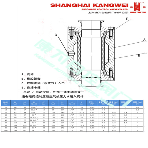 在KMC系列气动夹管阀只有内衬套和两个套管位于介质流中(和工作介质相接触)。